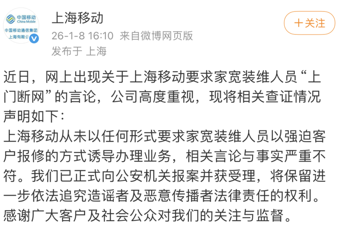 上海移动从未以任何形式要求家宽装维人员以强迫客户报修的方式诱导办理业务,相关言论与事实严重不符。我们已正式向公安机关报案并获受理,将保留进一步依法追究造谣者及恶意传播者法律责任的权利。感谢广大客户及社会公众对我们的关注与监督。